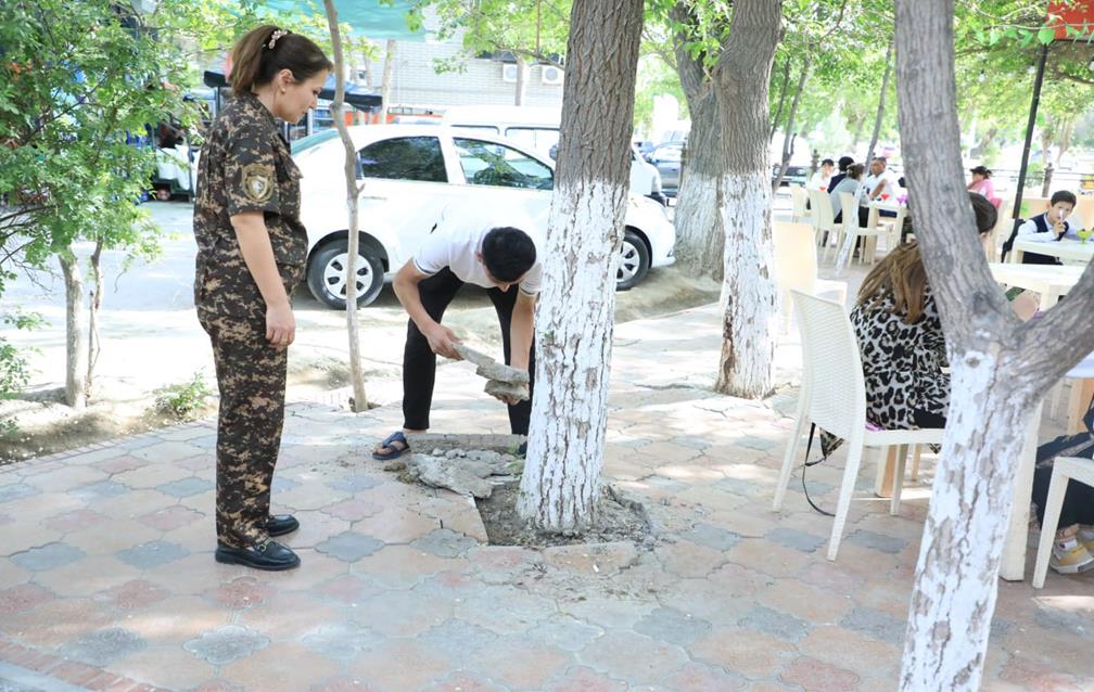 10. In Navoi, the “Give Breath to the Trees” environmental campaign month is currently being held. As part of this initiative, inspections were carried out in the “Bahor” neighborhood of Navoi city, where 12 cases of environmental violations were identified. Among them, electric wires and lights had been attached to 8 trees, while the bases of 4 trees had been covered with concrete.Immediate action was taken to remove the harmful electrical fixtures and concrete coverings, after which the trees were watered and restored. Responsible representatives of business entities involved were officially warned about the violations. The “Give Breath to the Trees” campaign continues actively across the region, organized by the Youth and Student Organization of Navoi State University to promote environmental awareness and protect urban greenery.