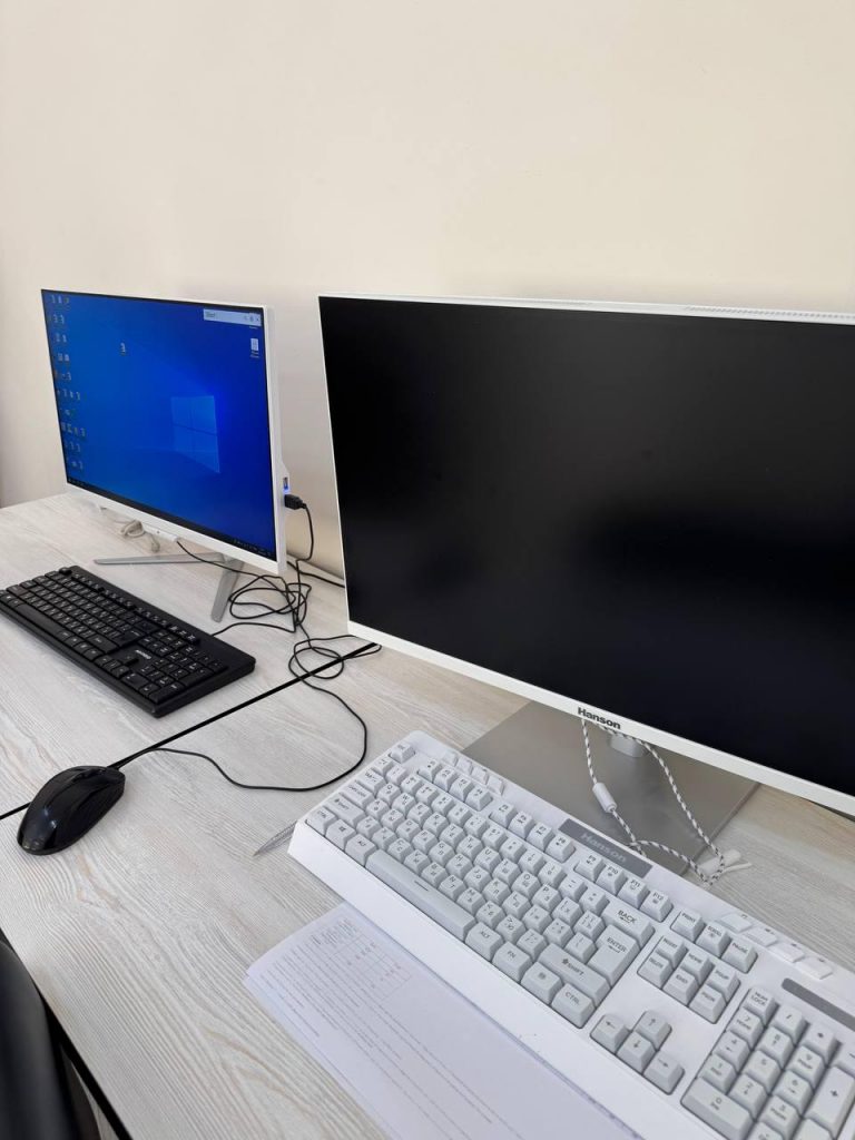 Navoi State University uses energy-efficient monoblock (all-in-one) computers in its computer labs and administrative offices. These devices combine the monitor and CPU into a single unit, consuming less power than traditional desktop setups. They also reduce cable clutter and generate less heat, leading to lower cooling needs and a more organized, eco-friendly workspace.