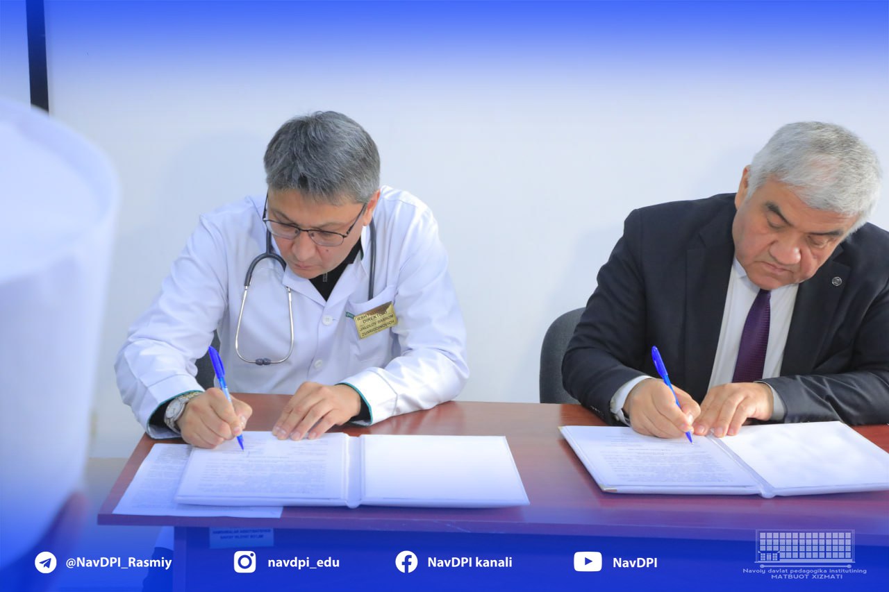 President of the Republic of Uzbekistan Sh.M. Mirziyoyev No. 5590 of December 7, 2018 (https://lex.uz/docs/4096197) and No. 6112 of November 17, 2020 (https://lex.uz/docs /5106550) today the rector of the Navoi State University professor A cooperation agreement was signed between B. Sobirov and B. Jalilov, director of the Navoi region branch of the Republican Scientific Center for Emergency Medical Care, Candidate of Medical Sciences. The agreement envisages internship of students of the Faculty of Medicine, conducting scientific research and other such collaborative activities in preventive treatment institutions Also, the students got acquainted with the opportunities created in the Navoi branch of RShTYoIM and got the necessary knowledge.