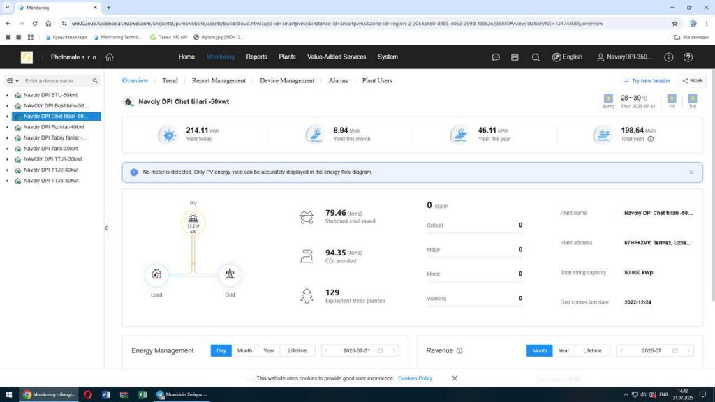 Navoi State University has adopted a smart energy management dashboard as part of its innovative energy efficiency and climate change programs. This digital platform provides real-time monitoring of solar energy production and energy flow across different university facilities. For example, the system tracks daily and annual energy yields, total CO₂ avoided, coal saved, and even the environmental impact in terms of equivalent trees planted. Such detailed insights help reduce energy waste, optimize power usage, and support data-driven decisions. The dashboard not only enhances operational efficiency but also educates students about practical applications of renewable energy and smart technology.